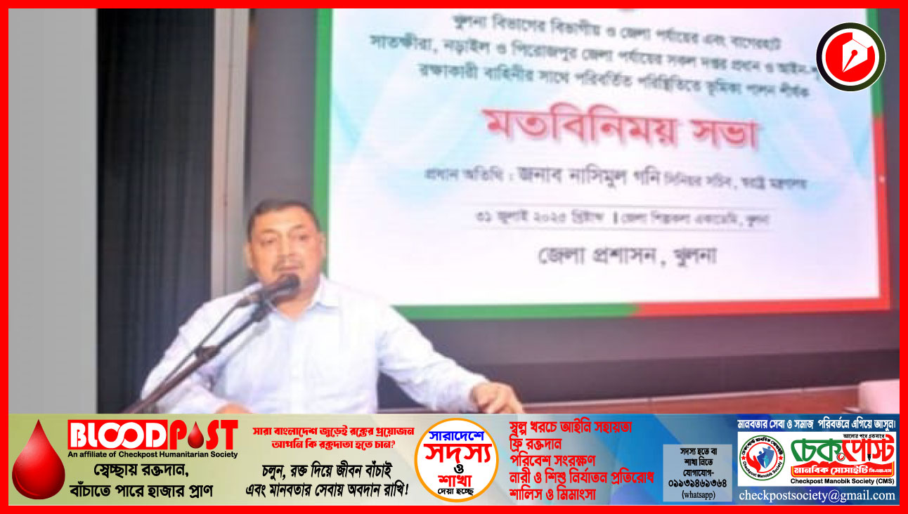 বৃহস্পতিবার (৩১ জুলাই) খুলনা জেলা শিল্পকলা একাডেমি অডিটোরিয়ামে খুলনা বিভাগ ও এর আওতাধীন জেলাগুলোর (খুলনা, বাগেরহাট, সাতক্ষীরা, নড়াইল, পিরোজপুর) সরকারি দপ্তরের প্রধান ও আইনশৃঙ্খলা রক্ষাকারী বাহিনীর কর্মকর্তাদের নিয়ে "পরিবর্তিত পরিস্থিতিতে ভূমিকা পালন" শীর্ষক এক মতবিনিময় সভায় প্রধান অতিথির বক্তব্যে তিনি এসব কথা বলেন।