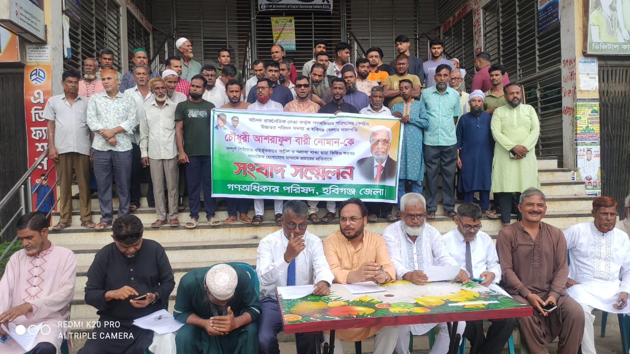 সোমবার (সময়: বেলা ১২টা) হবিগঞ্জ শহরের সাইফুর রহমান টাউন হলে আয়োজিত এক সংবাদ সম্মেলনে এ অভিযোগ তোলা হয়। সংবাদ সম্মেলনে বক্তারা জানান, সম্প্রতি এক সভায় বিএনপির কেন্দ্রীয় সাংগঠনিক সম্পাদক জি কে গউস, গণঅধিকার পরিষদের কেন্দ্রীয় উচ্চতর সদস্য ও হবিগঞ্জ জেলা সভাপতি এডভোকেট চৌধুরী আশরাফুল বারী নোমানকে অশালীন ভাষায় গালি দেন।