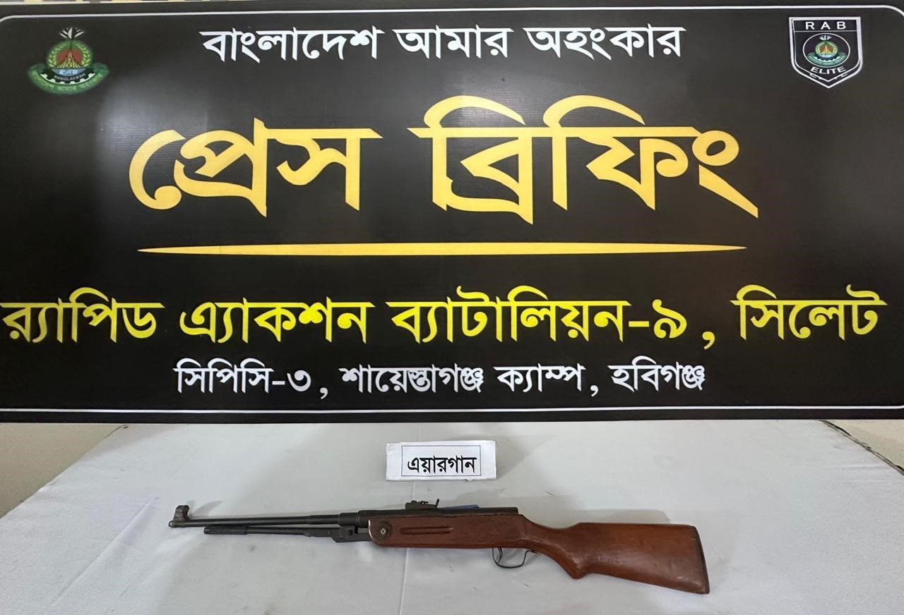 হবিগঞ্জের শায়েস্তাগঞ্জে র্যাব-৯ এর বিশেষ অভিযানে একটি এয়ারগান উদ্ধার করা হয়েছে। র্যাব-৯ শায়েস্তাগঞ্জ ক্যাম্প, হবিগঞ্জের একটি আভিযানিক দল অস্ত্র উদ্ধারের
